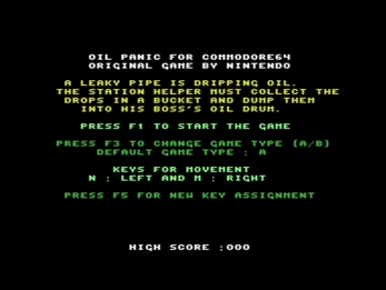 Oil Panic for Commodore 64 is a fan-made conversion. This is a non-profit fan project created for educational purposes and to celebrate the history of Commodore 64 programming. All characters and original game designs are trademarks of Nintendo Co.Ltd. This project is not affiliated with or endorsed by Nintendo.